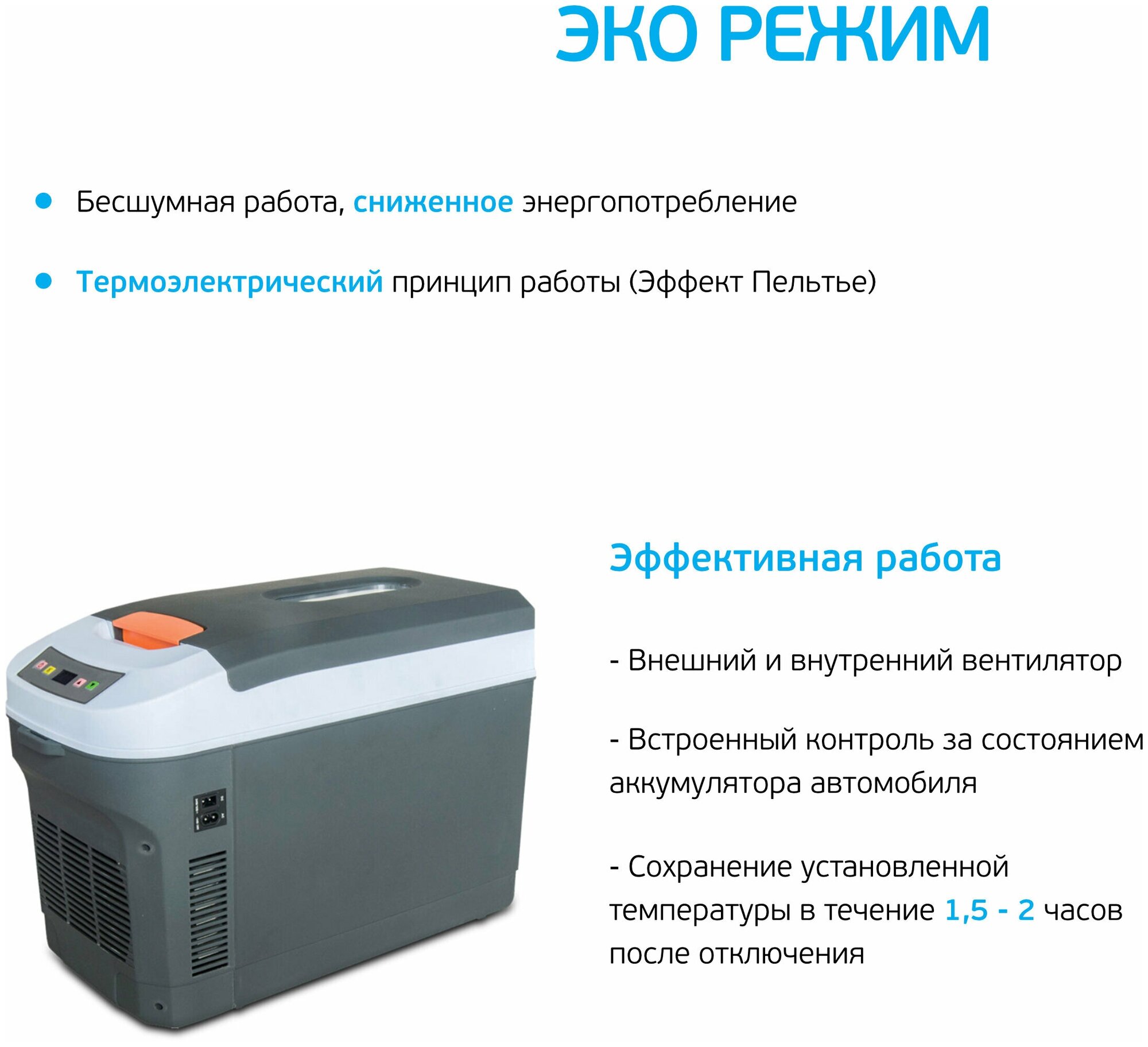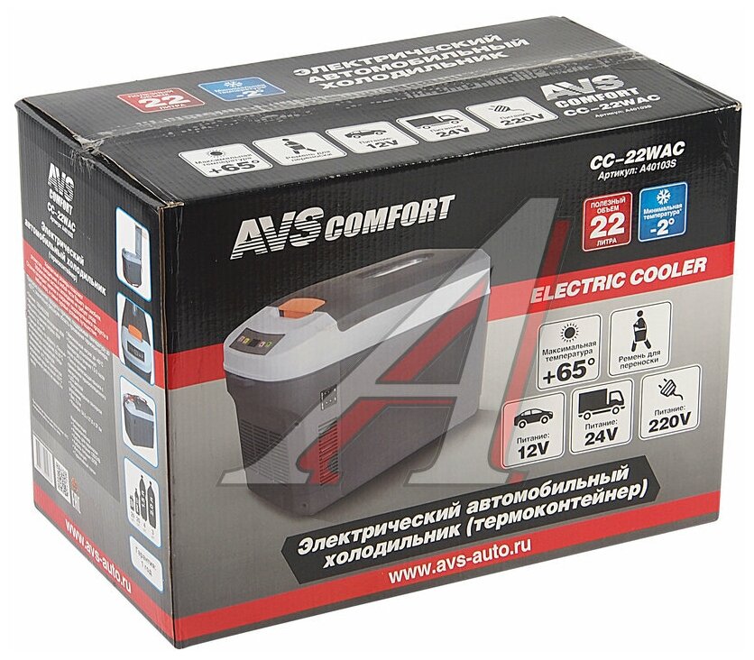 Type: container, principle of operation: thermoelectric, power supply: from the cigarette lighter, from the network, From the car network 12V, From the network 220V, voltage: 12 V, 220 V, 24 V, volume: 22 l, material: plastic, height: 37 cm , width: 50 cm