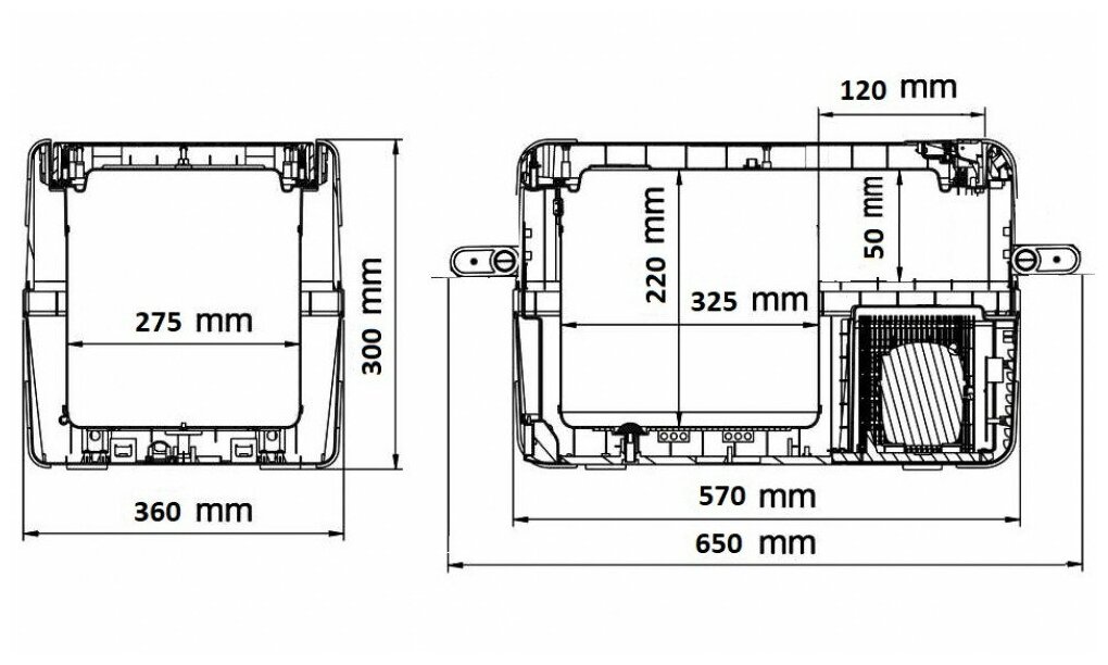 Type: container, operating principle: compressor, power supply: cigarette lighter, voltage: 12 V, 24 V, volume: 25 l, features: interior lighting, carrying handles, material: metal, plastic, height: 30.10 cm, width: 65.20 cm, depth