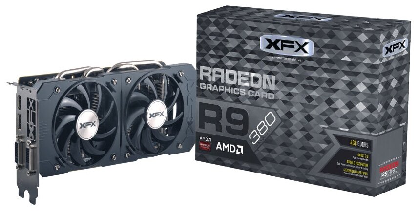 Graphics card name: AMD Radeon R9 380, video memory size: 4 GB, graphics card manufacturer: AMD, product line: Radeon, memory type: GDDR5, memory bus width: 256 bit, PCI Express version: 3.0, Number of HDMI outputs: 1, DisplayPort output