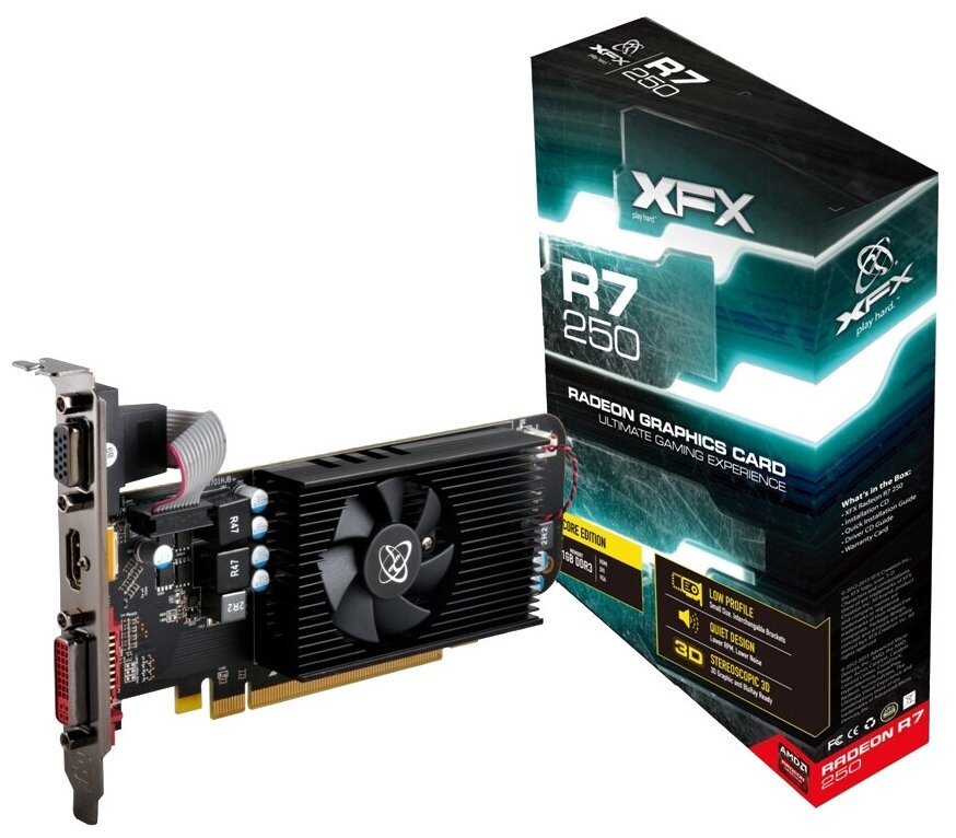 Graphics card name: AMD Radeon R7 250, video memory size: less than 2 GB, graphics card manufacturer: AMD, product line: Radeon, memory type: GDDR3, memory bus width: 128 bit, PCI Express version: 3.0, Number of HDMI outputs: 1