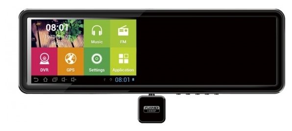 Rear view mirror, G-sensor, traffic information transmission, via GPRS connection to the Internet via Bluetooth DUN with a mobile phone GPRS modem, video shooting parameters 720P/60fps,1080P/30fps, viewing angle 120 degrees, camera resolution 1MP, MiniHDM