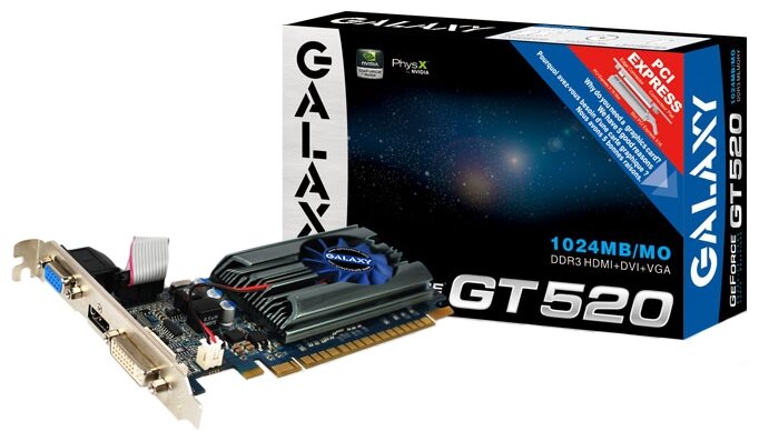 Graphics card name: NVIDIA GeForce GT 520, video memory size: less than 2 GB, graphics card manufacturer: NVIDIA, product line: GeForce, memory type: GDDR3, memory bus width: 64 bit, PCI Express version: 2.0