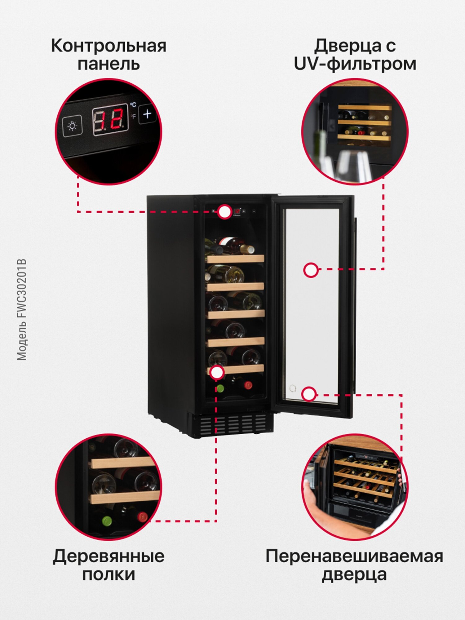 Height: 82 cm, width: 29.50 cm, depth: 61.50 cm, wine cabinet capacity, bottles: 20, number of chambers: 1, energy class: A, compressor type: standard, case color: black