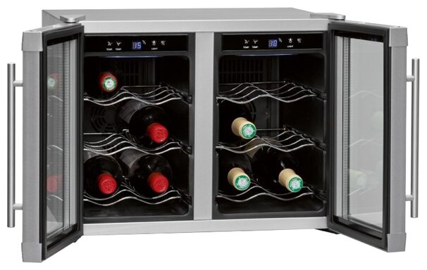 Height: 38.20 cm, width: 47.20 cm, depth: 51.90 cm, wine cabinet capacity, bottles: 12, number of chambers: 2, compressor type: standard, housing color: gray