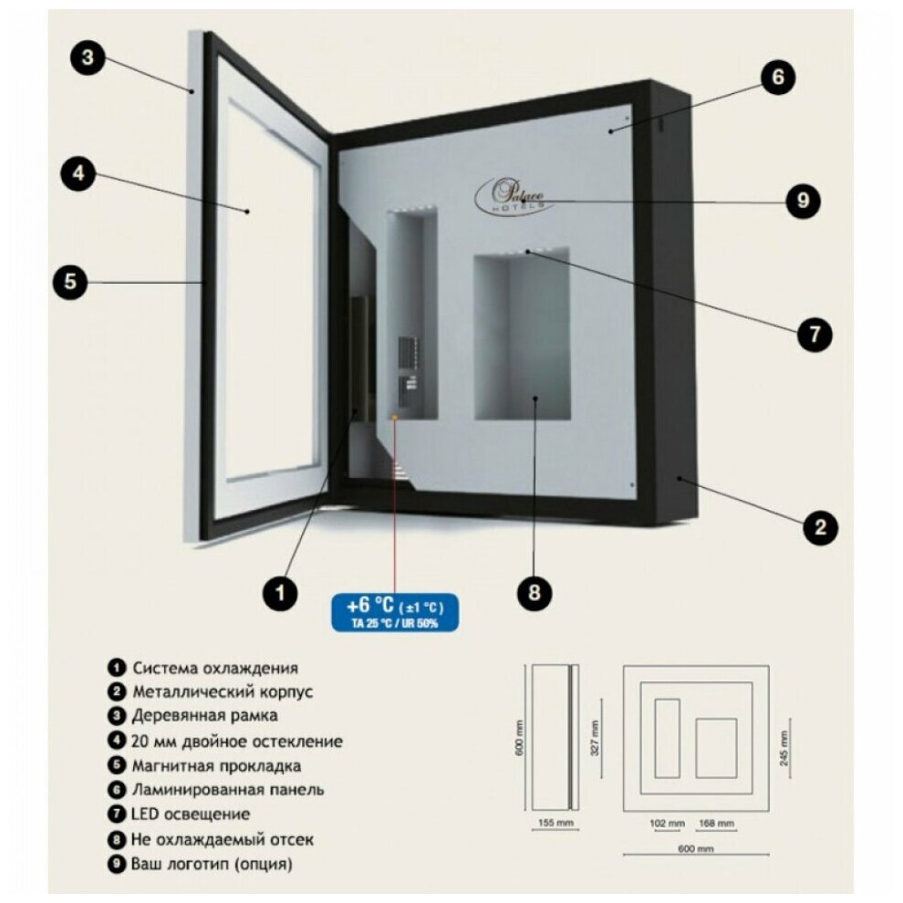 Wine cabinet type: single temperature, height: 60 cm, width: 60 cm, depth: 15.50 cm, wine cabinet capacity, bottles: 1, number of chambers: 1, compressor type: standard, housing color: black