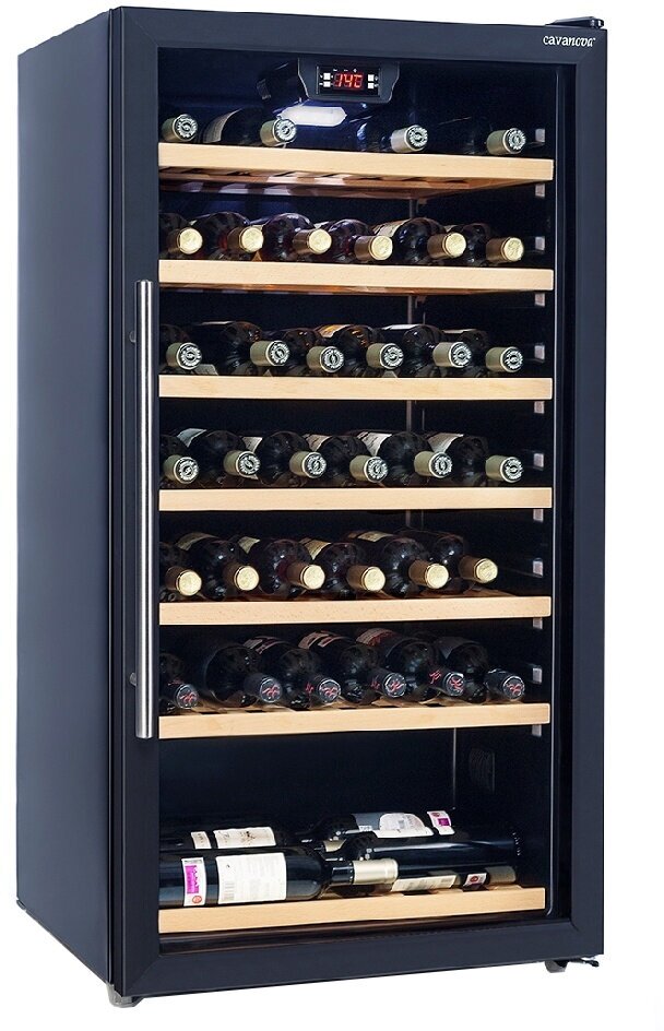 Wine cabinet type: single temperature, height: 113 cm, width: 59.50 cm, depth: 56.50 cm, wine cabinet capacity, bottles: 78, number of chambers: 1, compressor type: standard, housing color: black