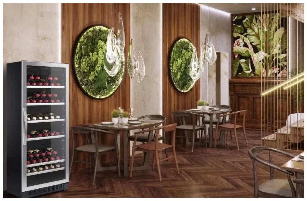 Wine cabinet type: single temperature, height: 147.60 cm, width: 59.50 cm, depth: 57.50 cm, wine cabinet capacity, bottles: 101, number of chambers: 1, energy efficiency class: A, cabinet color: silver