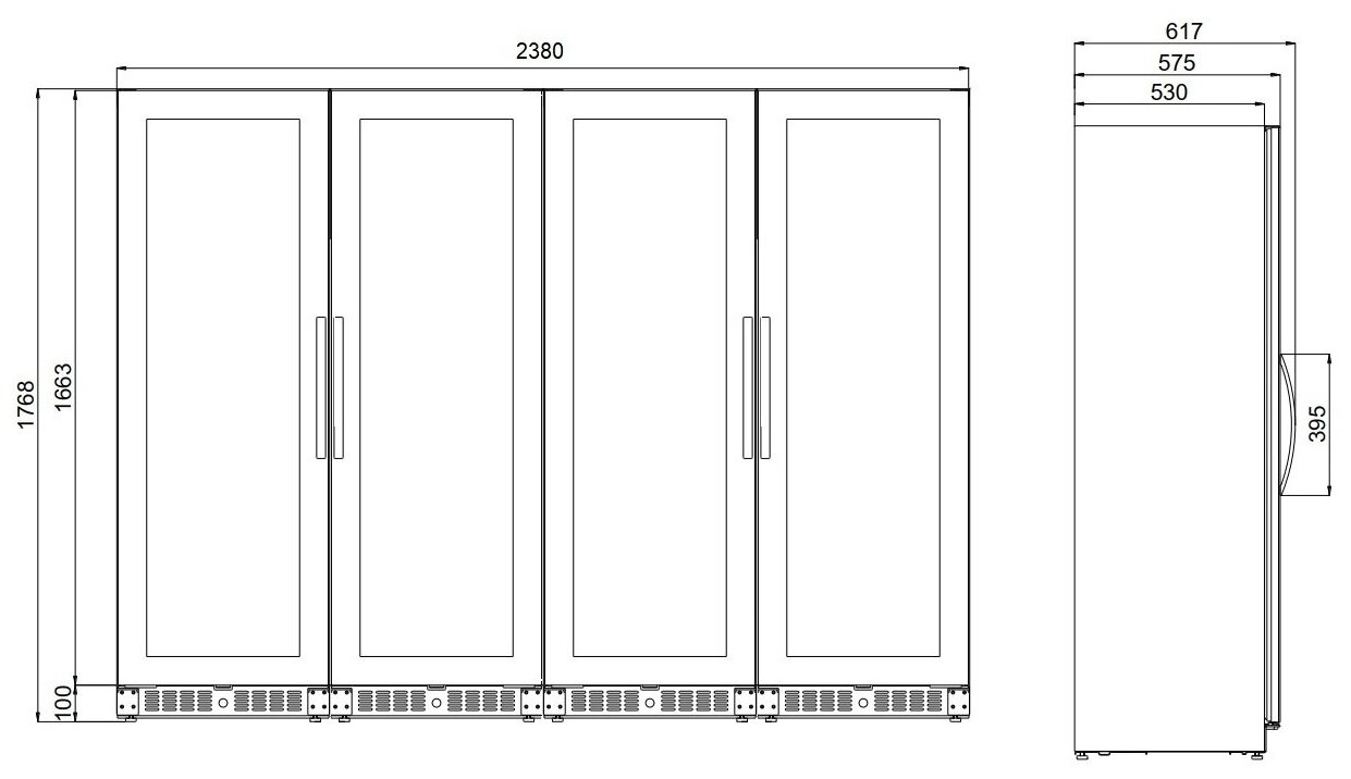Wine cabinet type: two-temperature, height: 176.80 cm, width: 238 cm, depth: 57.50 cm, wine cabinet capacity, bottles: 460, number of chambers: 4, energy efficiency class: A, cabinet color: black