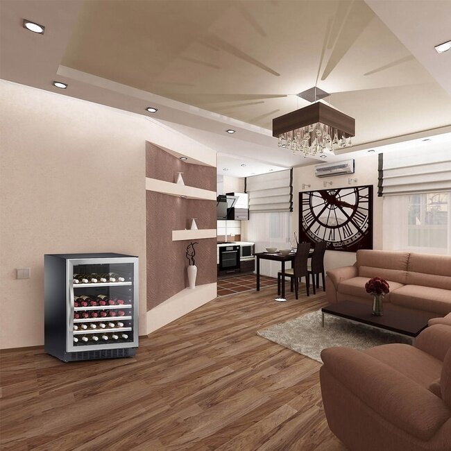 Wine cabinet type: single temperature, height: 82 cm, width: 59.50 cm, depth: 57.50 cm, wine cabinet capacity, bottles: 50, number of chambers: 1, energy efficiency class: A, cabinet color: silver