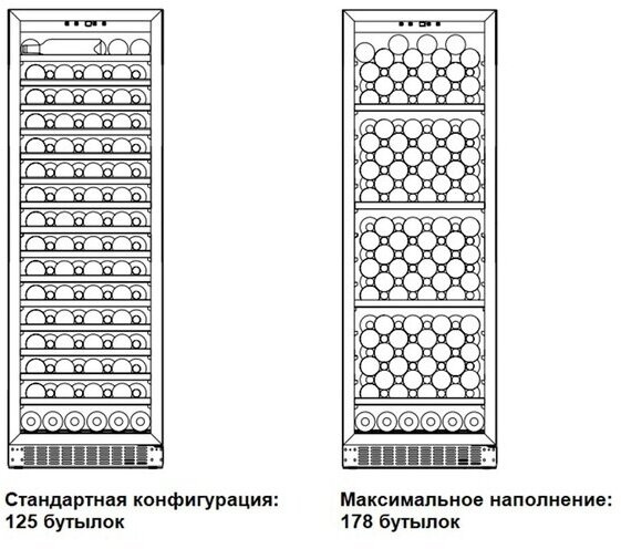 Wine cabinet type: single temperature, height: 188 cm, width: 67 cm, depth: 62 cm, wine cabinet capacity, bottles: 125, number of chambers: 1, energy efficiency class: A, cabinet color: black