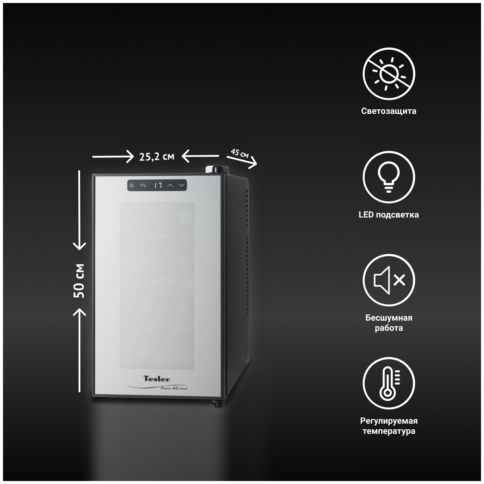 Wine cabinet type: single temperature, height: 50 cm, width: 25.20 cm, depth: 45 cm, wine cabinet capacity, bottles: 8, number of chambers: 1, energy efficiency class: A+, compressor type: standard, cabinet color: gray