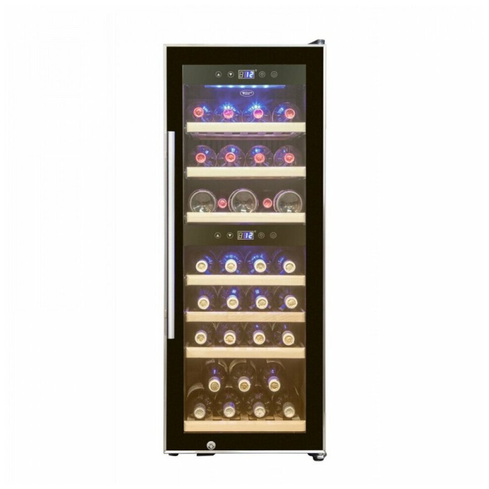 Wine cabinet type: two-temperature, height: 103 cm, width: 39.50 cm, depth: 63 cm, wine cabinet capacity, bottles: 38, number of chambers: 2, energy efficiency class: C, cabinet color: black
