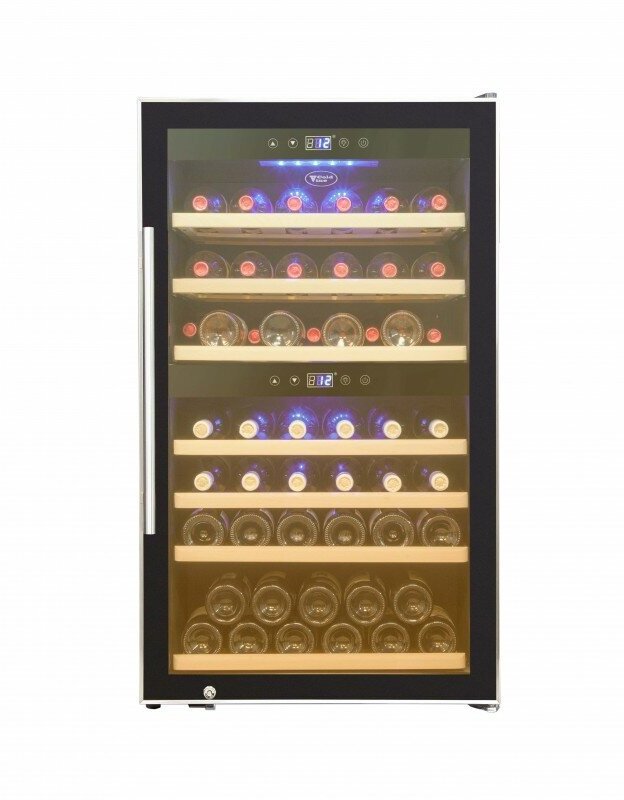 Wine cabinet type: two-temperature, height: 104.50 cm, width: 59.50 cm, depth: 63.50 cm, wine cabinet capacity, bottles: 66, number of chambers: 1, energy efficiency class: C, compressor type: standard, cabinet color: black