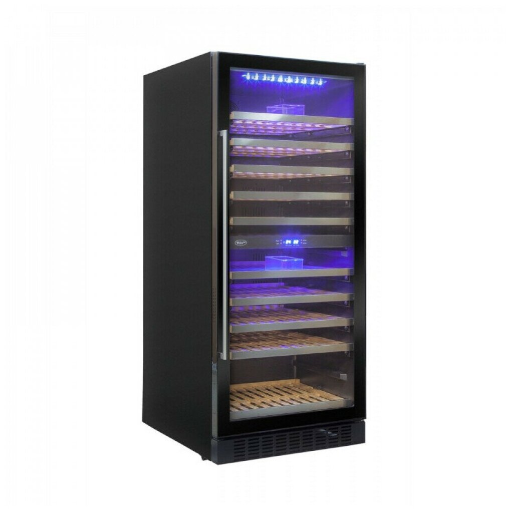 Wine cabinet type: two-temperature, height: 139 cm, width: 59.50 cm, depth: 67.70 cm, wine cabinet capacity, bottles: 110, number of chambers: 1, energy class: D, compressor type: standard, housing color: black