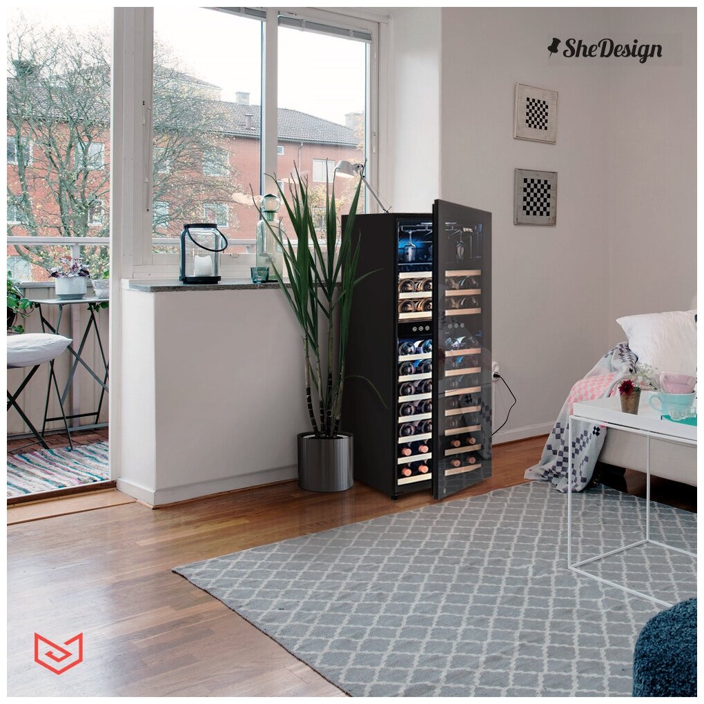 Wine cabinet type: two-temperature, height: 127.50 cm, width: 49.50 cm, depth: 58 cm, wine cabinet capacity, bottles: 73, number of chambers: 2, energy efficiency class: B, cabinet color: black