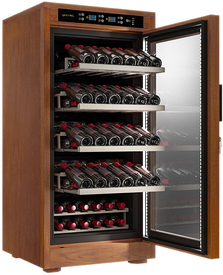 Wine cabinet type: single temperature, height: 131 cm, width: 66 cm, depth: 61 cm, wine cabinet capacity, bottles: 66, number of chambers: 1, compressor type: standard, housing color: brown