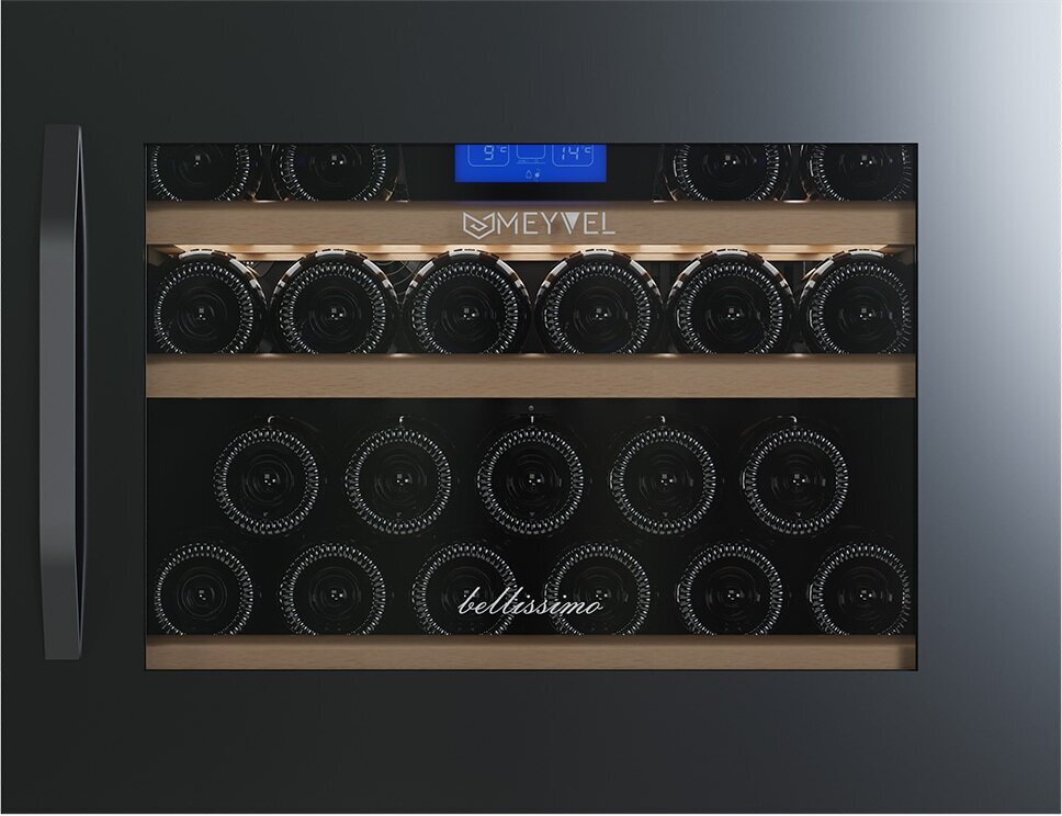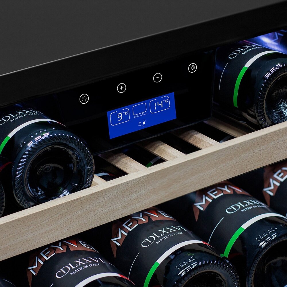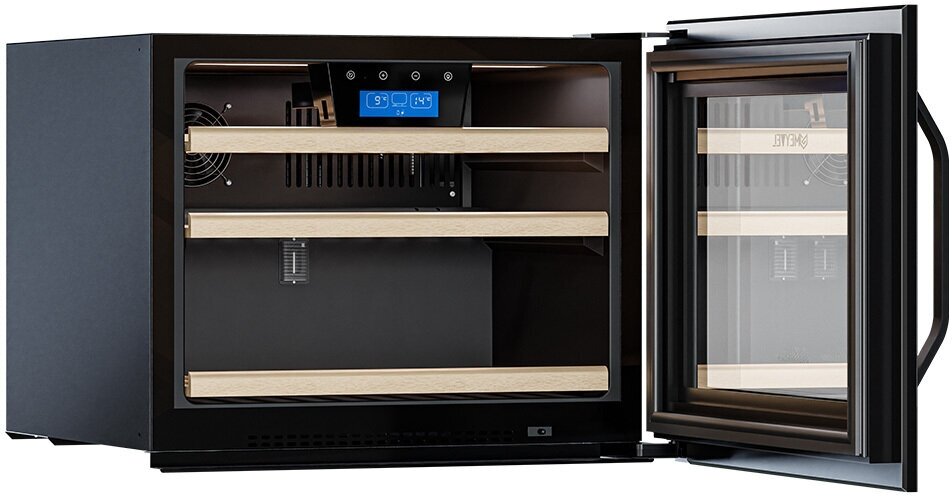 Wine cabinet type: two-temperature, height: 45.60 cm, width: 59.40 cm, depth: 56 cm, wine cabinet capacity, bottles: 22, number of chambers: 1, energy efficiency class: G, cabinet color: black