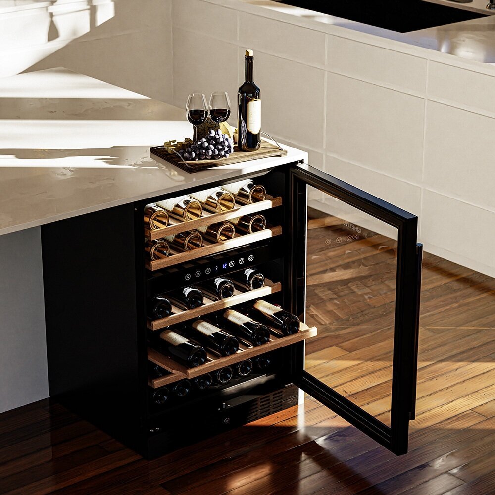 Wine cabinet type: two-temperature, height: 84 cm, width: 59.50 cm, depth: 57 cm, wine cabinet capacity, bottles: 46, number of chambers: 1, energy efficiency class: B, cabinet color: black