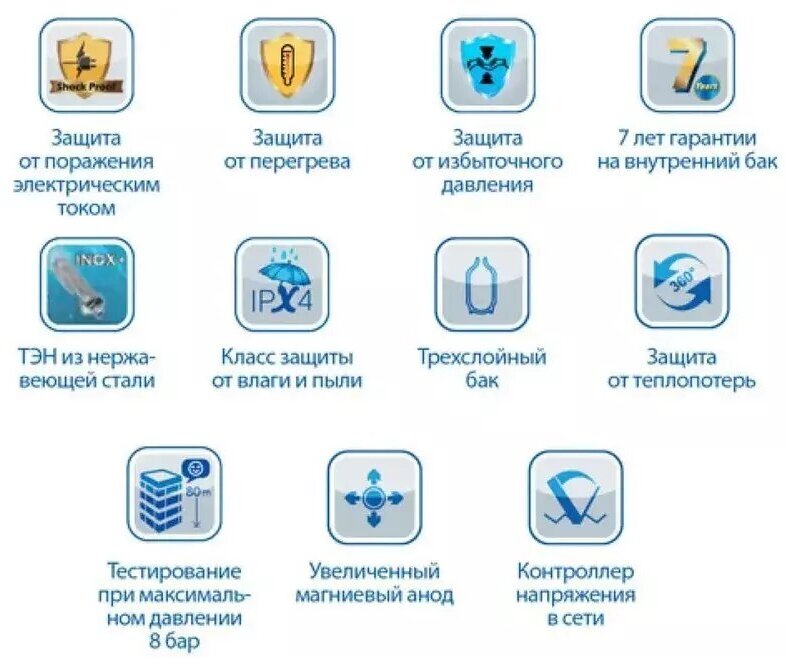 Total power of heating elements: 1.5 kW; min. water pressure: 0.5 atm; Max. water pressure: 8 atm; heating temperature limitation; heating element material: stainless steel; degree of protection against water: 4