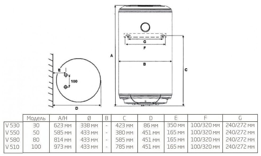 Description: Type of water heater: accumulative, tank volume: 100 l, heating method: electric, installation: wall-mounted, position: vertical, connection: bottom, inner lining of the tank: glass-ceramic, mains voltage: 220, consumption