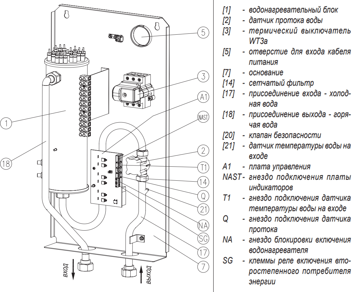Min. water pressure: 0.1 atm; heating temperature limitation; type of electric heating element: tubular; instantaneous electric water heater control: electronic