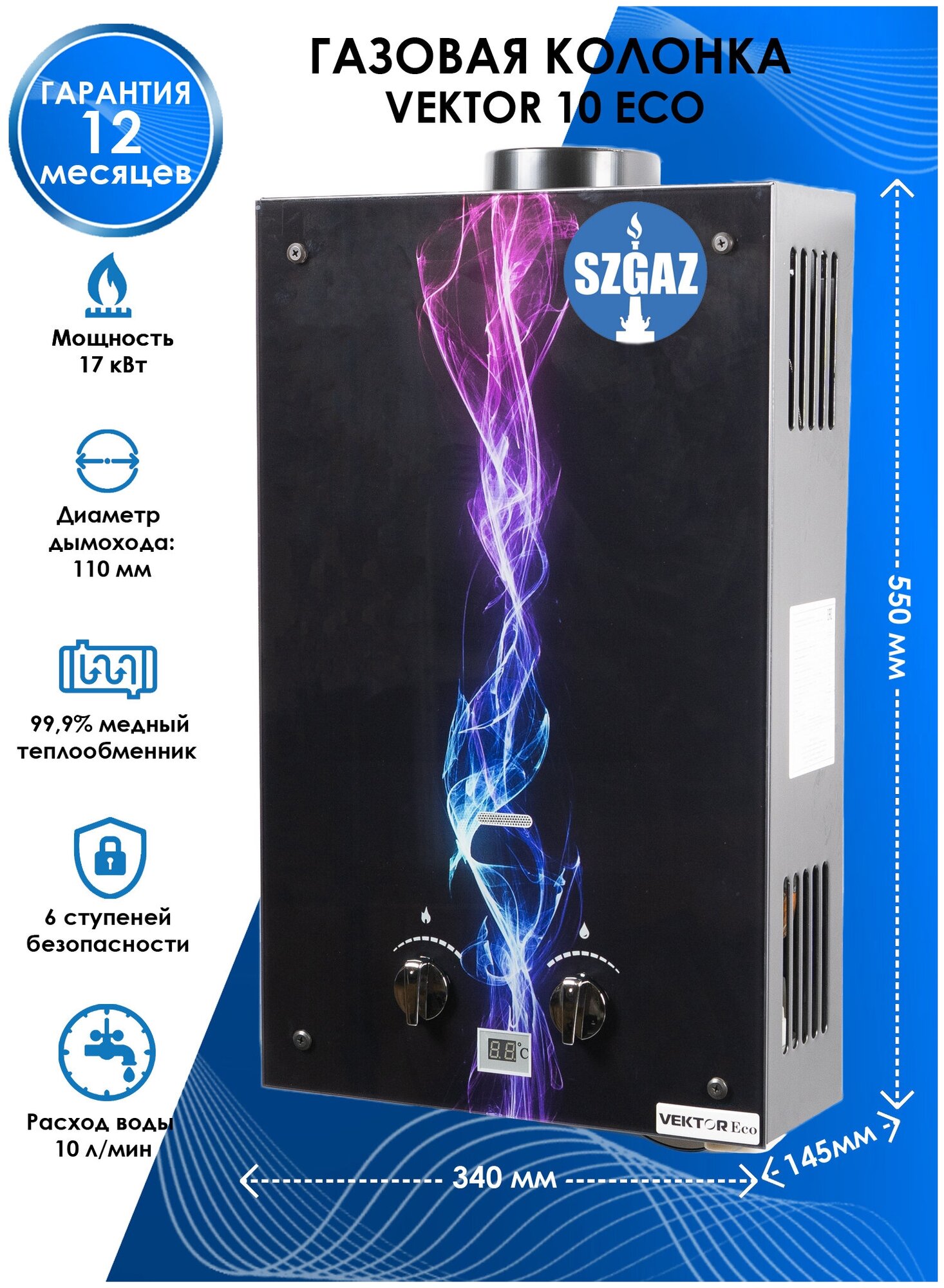 Water heater type: instantaneous, heating method: gas, installation: wall-mounted, location: vertical, connection: bottom, depth: 145 mm, width: 340 mm, height: 550 mm, control: mechanical, protection systems: gas control