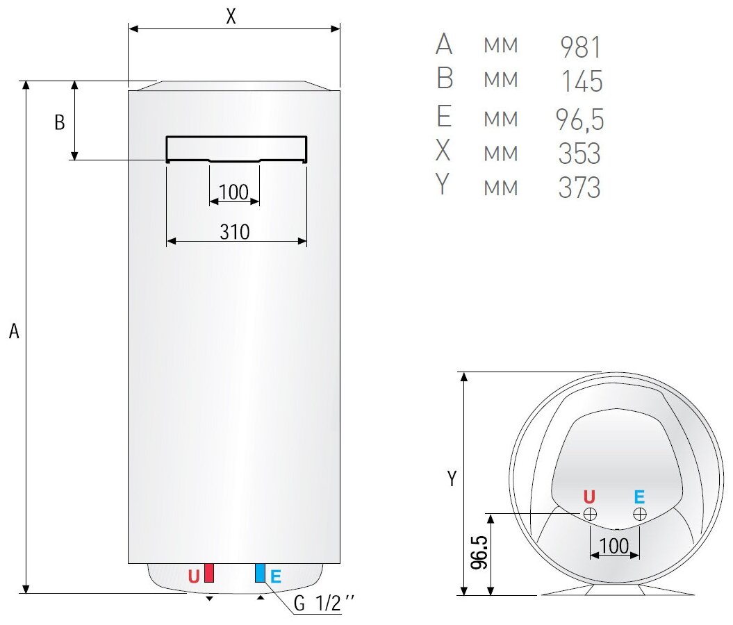 Type of water heater: accumulative, tank volume: 100 l, heating method: electric, installation: wall-mounted, position: vertical, connection: bottom, inner lining of the tank: glass-ceramic, mains voltage: 220, consumption