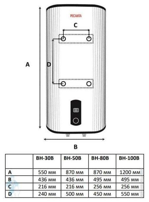 Type of water heater: accumulative, tank volume: 100 l, heating method: electric, installation: wall-mounted, position: vertical, connection: bottom, inner lining of the tank: glass-ceramic, mains voltage: 220, consumption