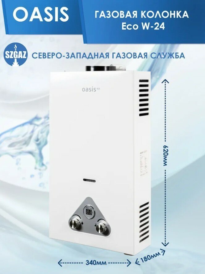 Type of water heater: instantaneous, heating method: gas, installation: wall-mounted, vertical, location: vertical, connection: bottom, power consumption: 24 kW, depth: 180 mm, width: 340 mm, height: 620 mm, control