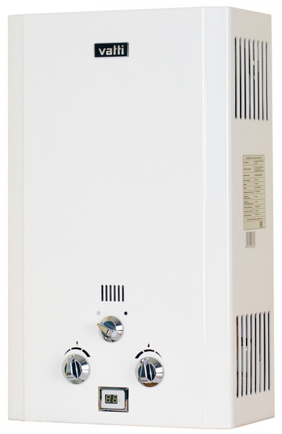 Water heater type: instantaneous, heating method: gas, installation: wall-mounted, location: vertical, connection: bottom, depth: 180 mm, width: 330 mm, height: 550 mm, control: electronic, features: display