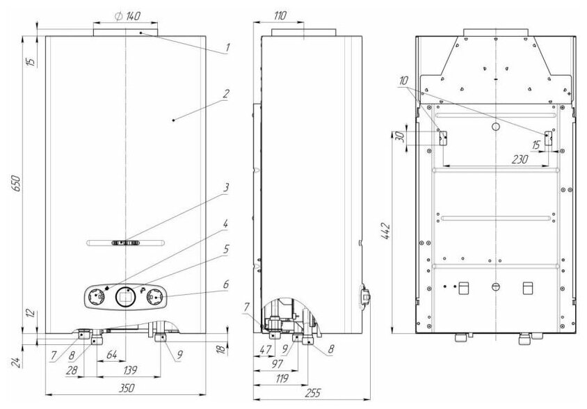 Additional Information: Min. water pressure: 0.15 atm; type of ignition: electric ignition; water and gas connection diameter: ½; flue diameter: 140 mm