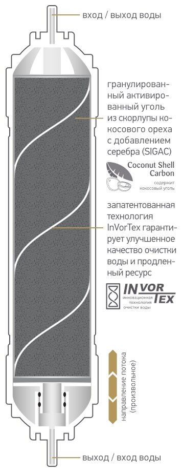 InVorTex® technology the movement of water in a spiral inside the filter element increases the path of water in the filter medium and prolongs the contact time of water with the sorbent