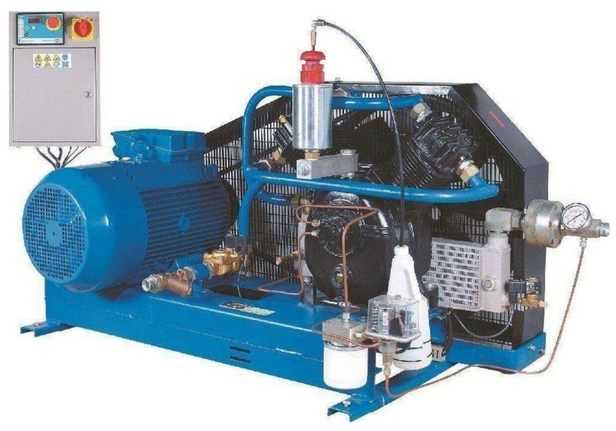 Piston compressor, electric motor, oil, 22 kW, 29.92 hp, pressure 35 bar, belt drive, no. of cylinders: 3, no. of compression stages: 3