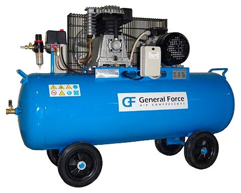 Piston compressor, electric motor, oil, 2.20 kW, 2.99 hp, pressure 9 bar, capacity 480 l/min, belt drive, reservoir volume 100 l, number of cylinders: 2, number of compression stages: 1