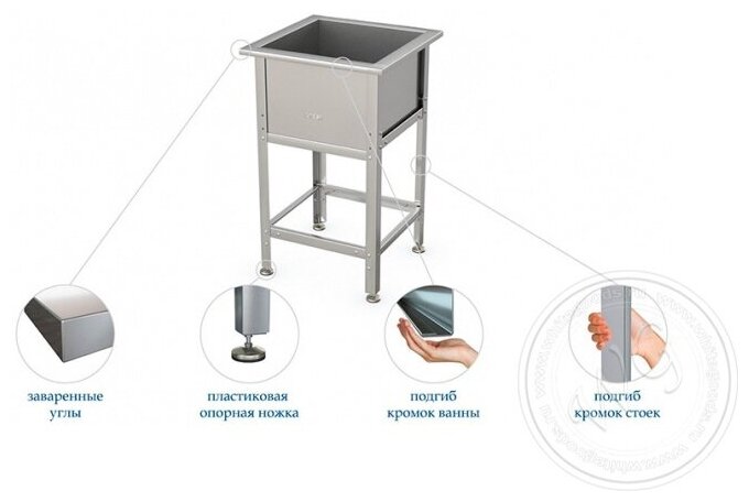 Drain hole diameter 48 mm; the width of the sides along the perimeter of the bath is 50 mm; bathtub metal thickness 0.8 mm; frame - galvanized steel 1.2 mm; legs - corner 40x40 mm; support leg adjustment range ±20 mm