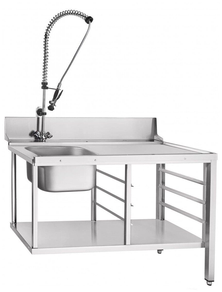 The table has a seamless tub for pre-rinsing dishes 400x400x250 mm, a shower device for cold and hot water, legs adjustable in height, a lower shelf and guides for installing three