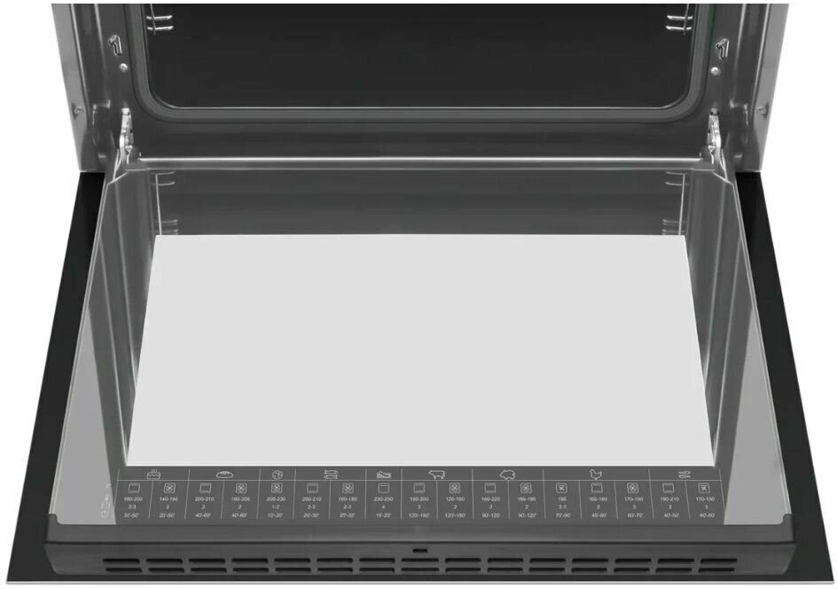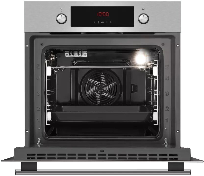 Electronic clock, cooling fan, sound timer with switch-off, EasyControl programmer type, quick preheating 150° for 4 min, removable door glass, recipes on the inner door glass, chrome-plated on
