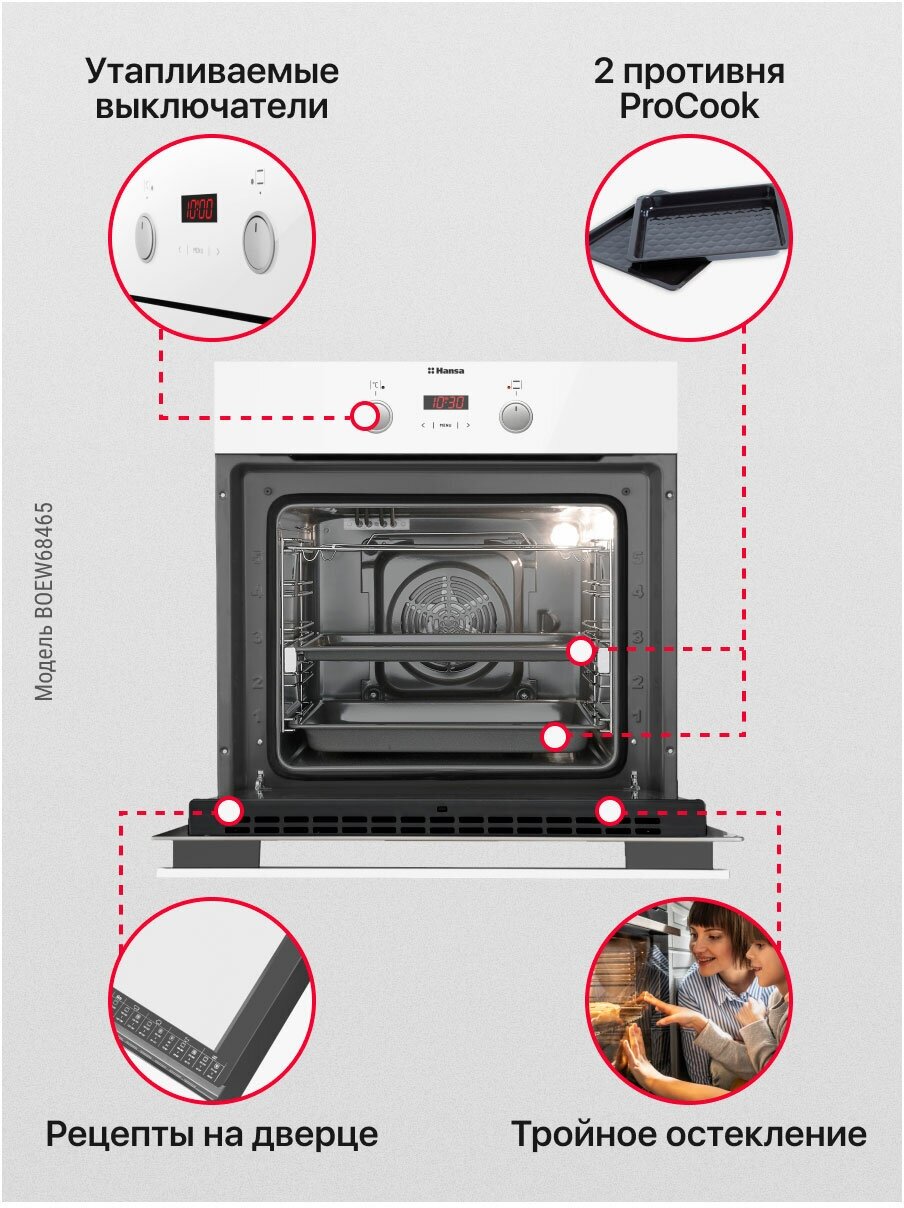 Electronic clock, cooling fan, sound timer with switch-off, EasyControl programmer type, quick preheating 150° for 4 min, removable door glass, recipes on the inner door glass, chrome-plated on