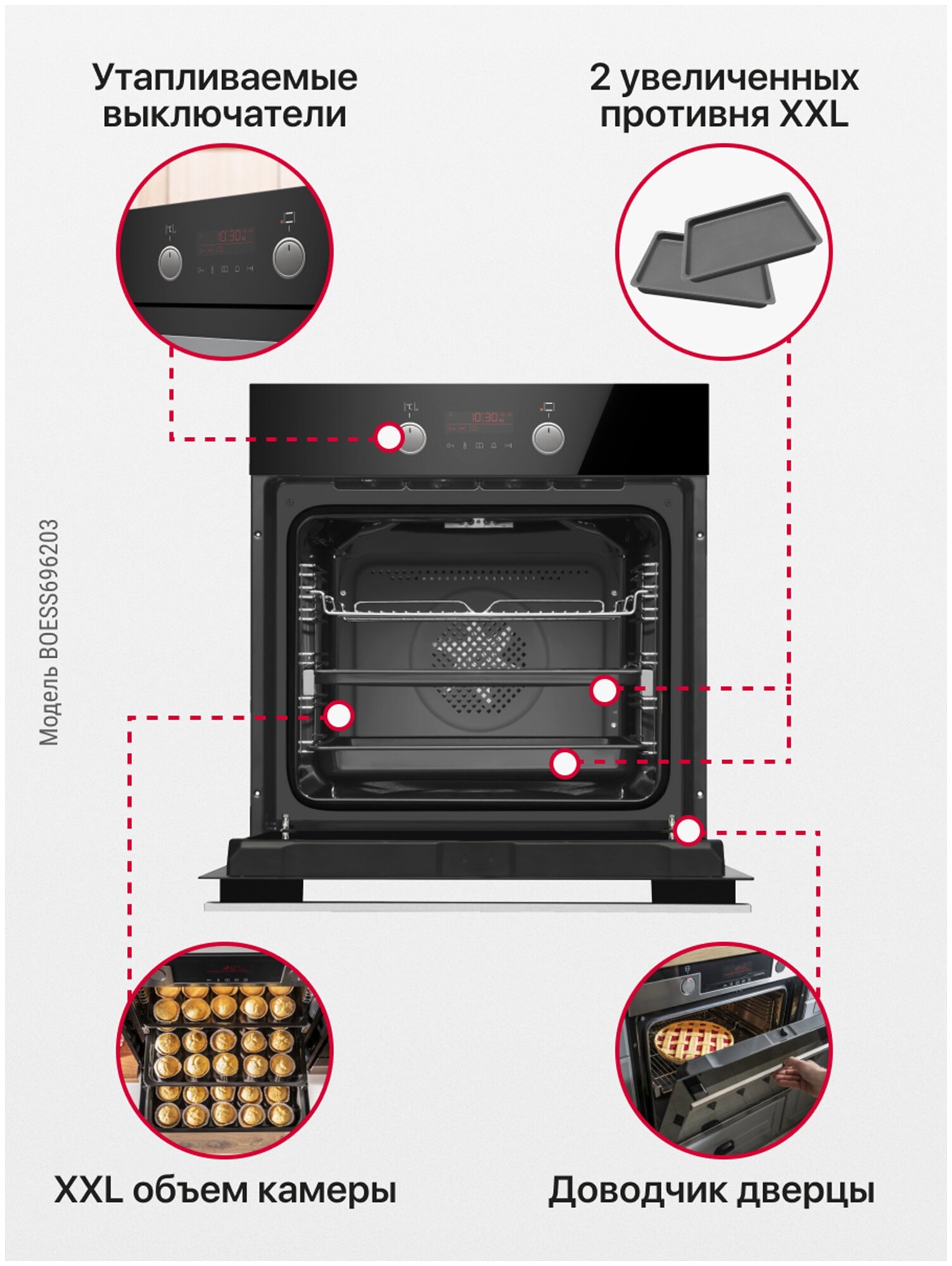 Electronic clock, sound timer with switch-off, programmer type PRO Control Tn, fast preheating 150° for 3 min, removable door glass, recipes on the inner door glass, chrome-plated food guides