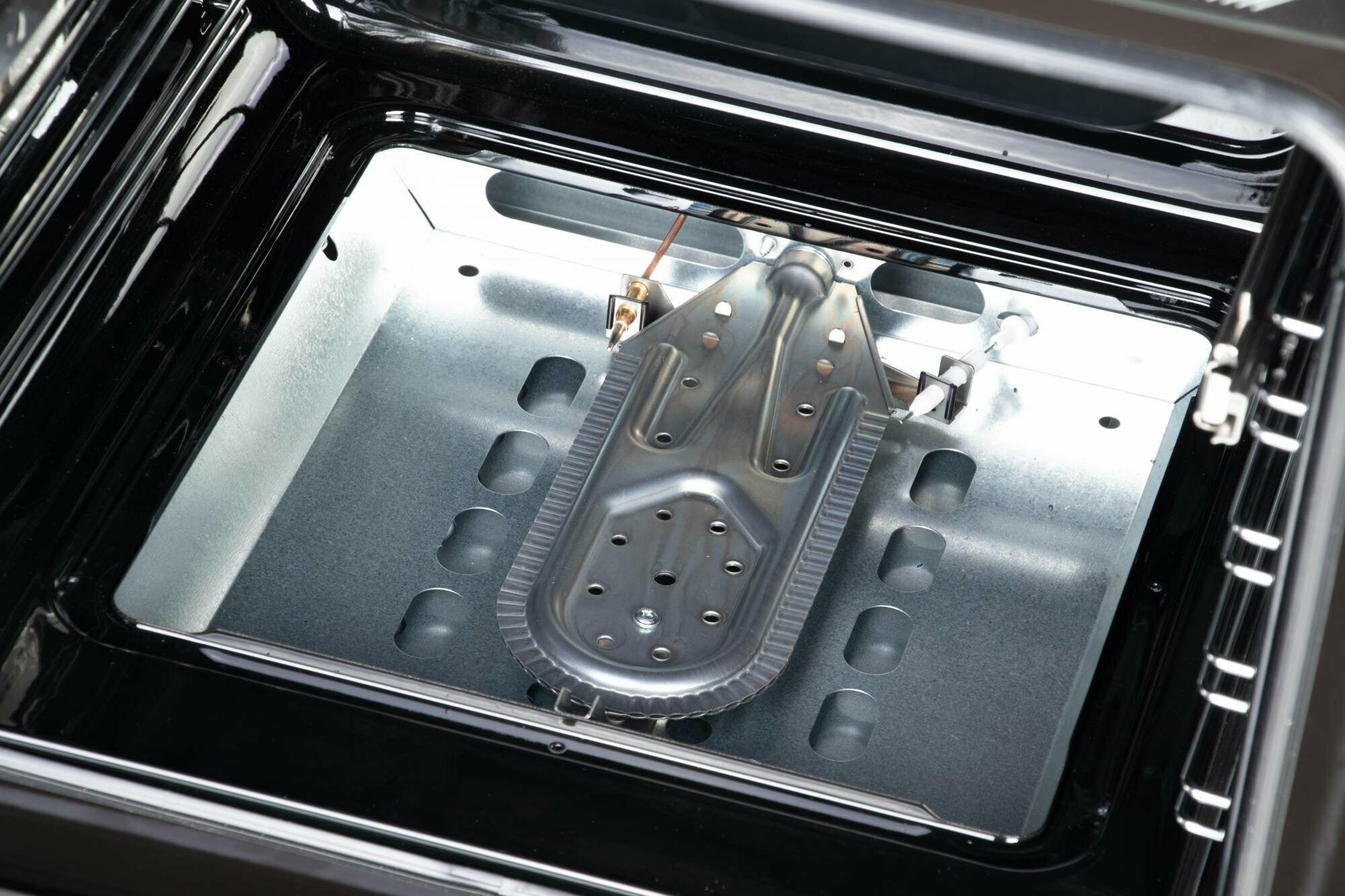 Oven, set of wire guides, baking tray, brazier for collecting fat, grill, telescopic shelves, skewer, barbecue, glass baking dish, replaceable nozzle for connecting gas