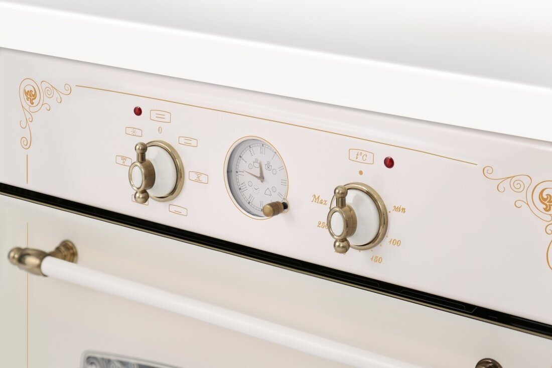 Color: cream with "retro" pattern; the design does not provide for cleaning the oven with steam; clock type: analog; cooling Fan
