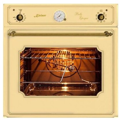 5 levels of installation of baking sheets; chrome-plated fork for baking sheets; 2 enameled baking sheets; universal glass baking sheet; grate; frame with a fork for a skewer; recipe chart on the inside