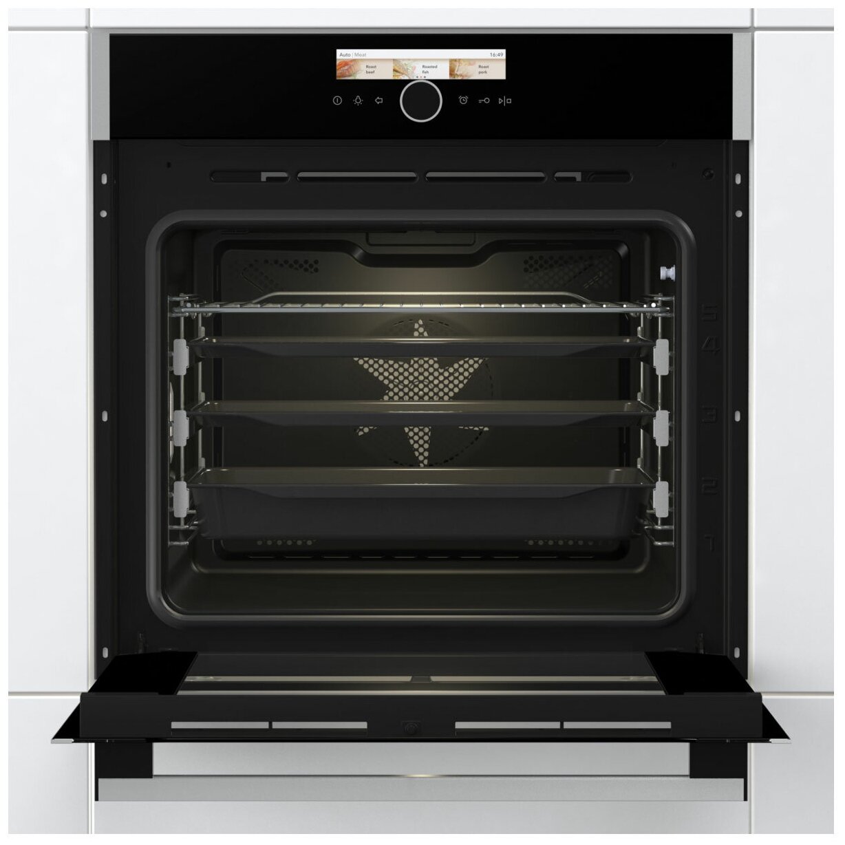 Rapid heating, dish warmer, defrosting, timer, two-level cooking, oven door closer, temperature probe