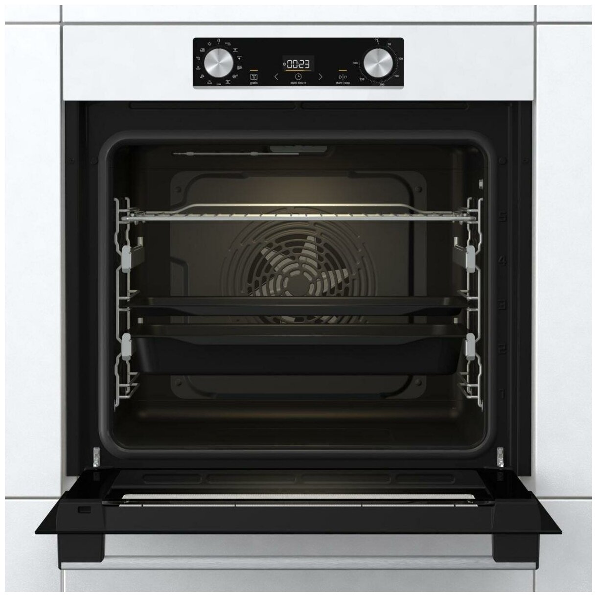 Partially retractable telescopic rails on 2 levels, deep enamelled pan, shallow enamelled tray, grid, meat core probe