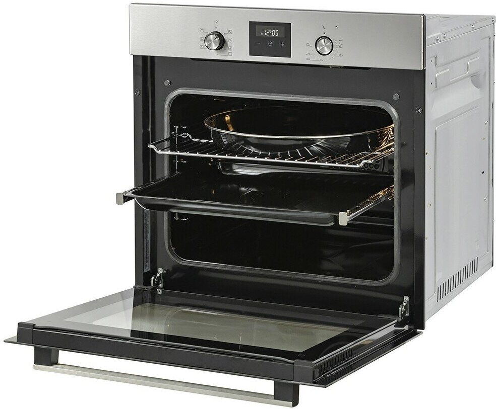 At the first start, we recommend heating the oven for 15 minutes at 200°C with a baking sheet filled with 300-400 g water to burn through the factory grease; watch type: electronic; cooling Fan
