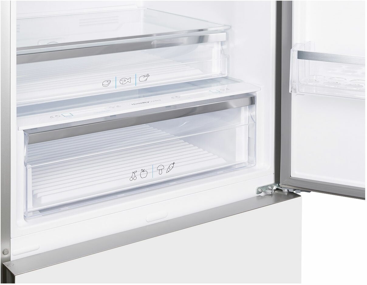 LED display, LED camera lighting, antibacterial plastic, bottle holder, hinged door shelves: 4; compartment for vegetables:1; egg shelf, freezer shelf: 1; ice container: 1 pc; ice maker: yes mechanical