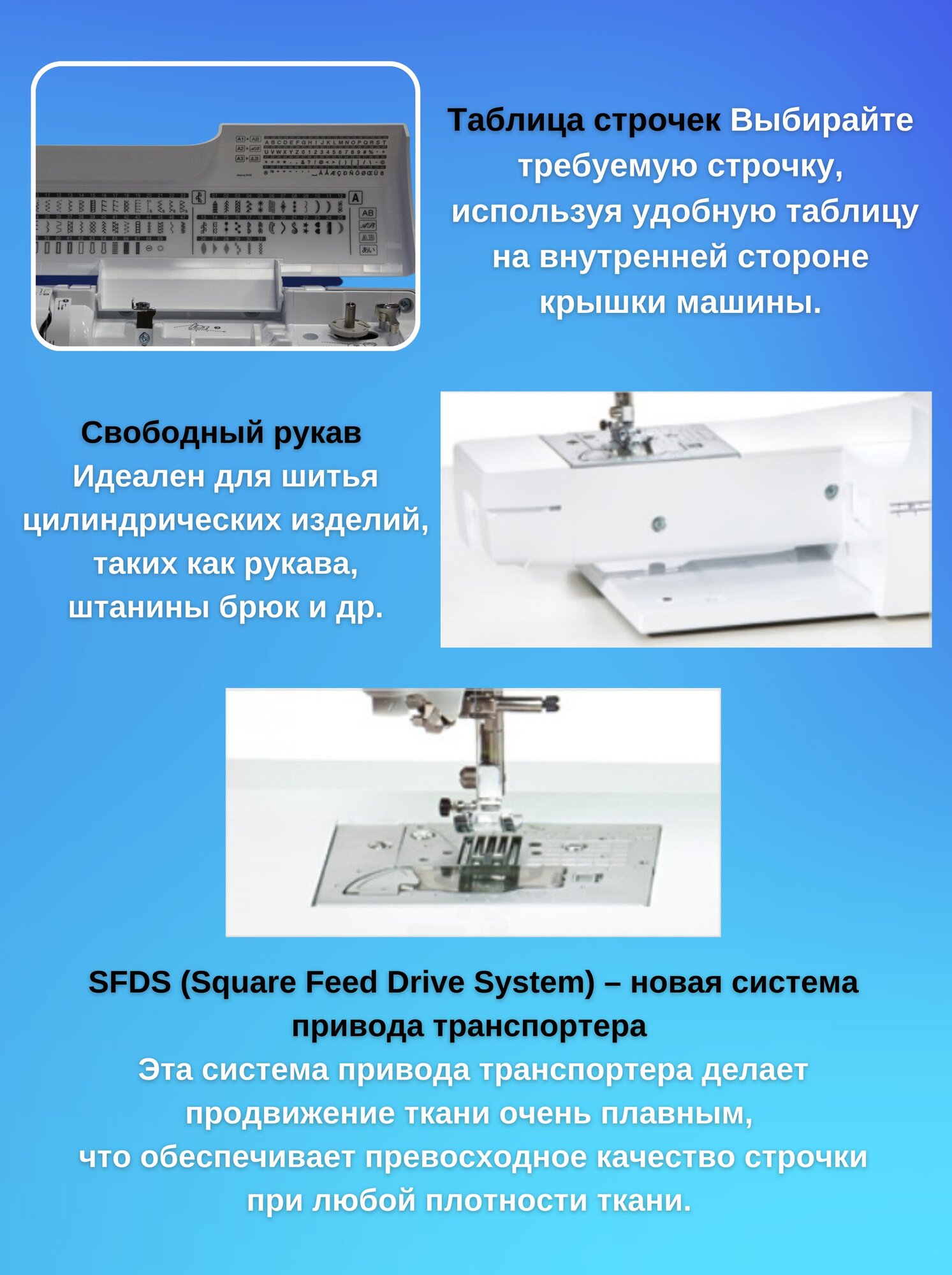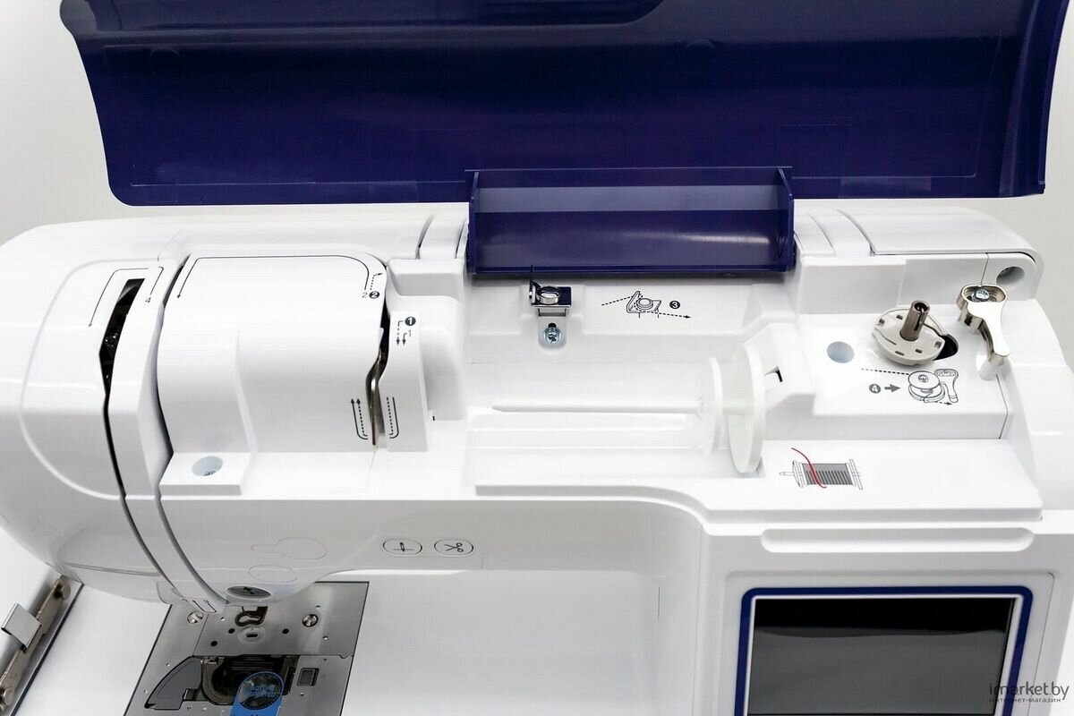 Hook: rotary horizontal, power: 55 W, speed adjustment: smooth, display: touch color, USB port, maximum embroidery speed: 650 ties/hour, number of sewing operations: 149 pieces, sleeve platform