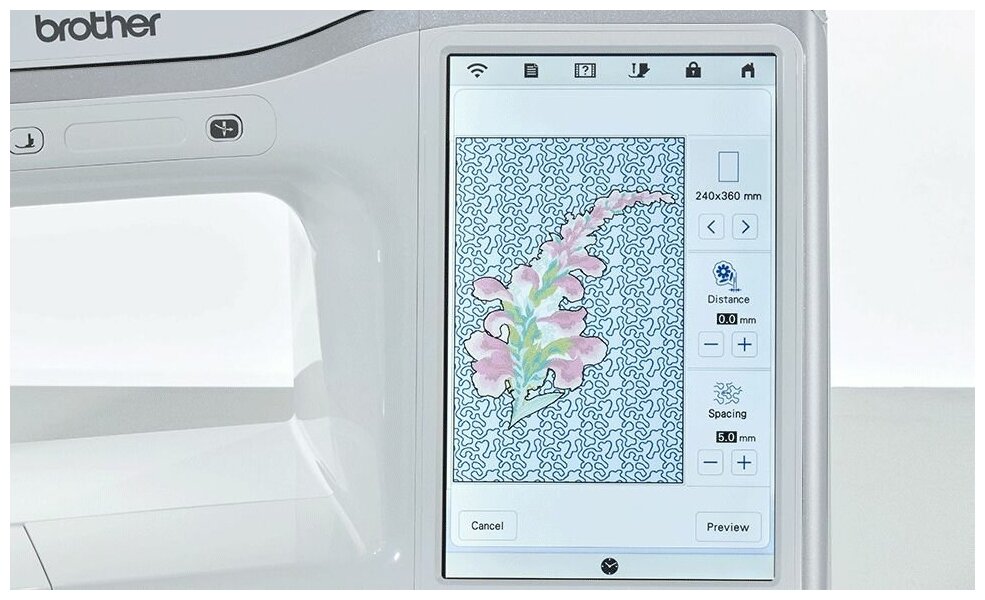 Hook: rotary vertical, power: 50 W, speed adjustment: smooth, foot pressure adjustment, display: monochrome touch, PC control, USB port, maximum embroidery speed: 650 ties/hour, quantity