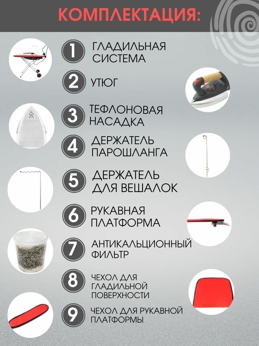 Type: ironing system, steam pressure: 4 bar, steam generator power: 1450 W, consumption at constant steam supply: 80 g/min, additional functions: active ironing board, surface blowing, steam extraction, worktop heating