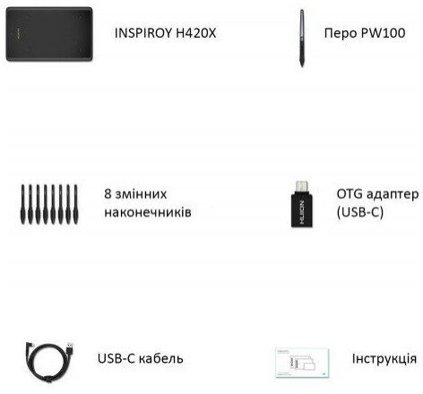 Graphic tablet, pen, usb type-c adapter, nibs – 8 pcs, nib removal tweezers, usb type-c cable, user manual